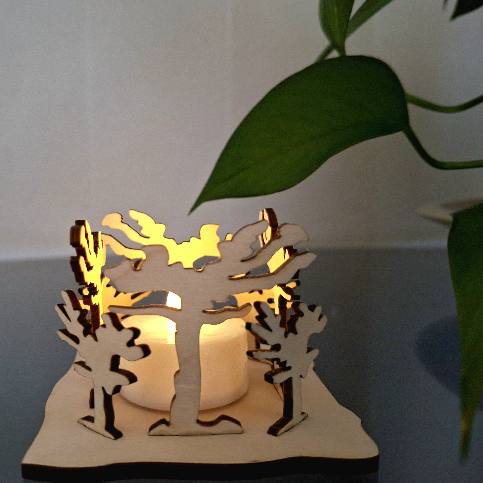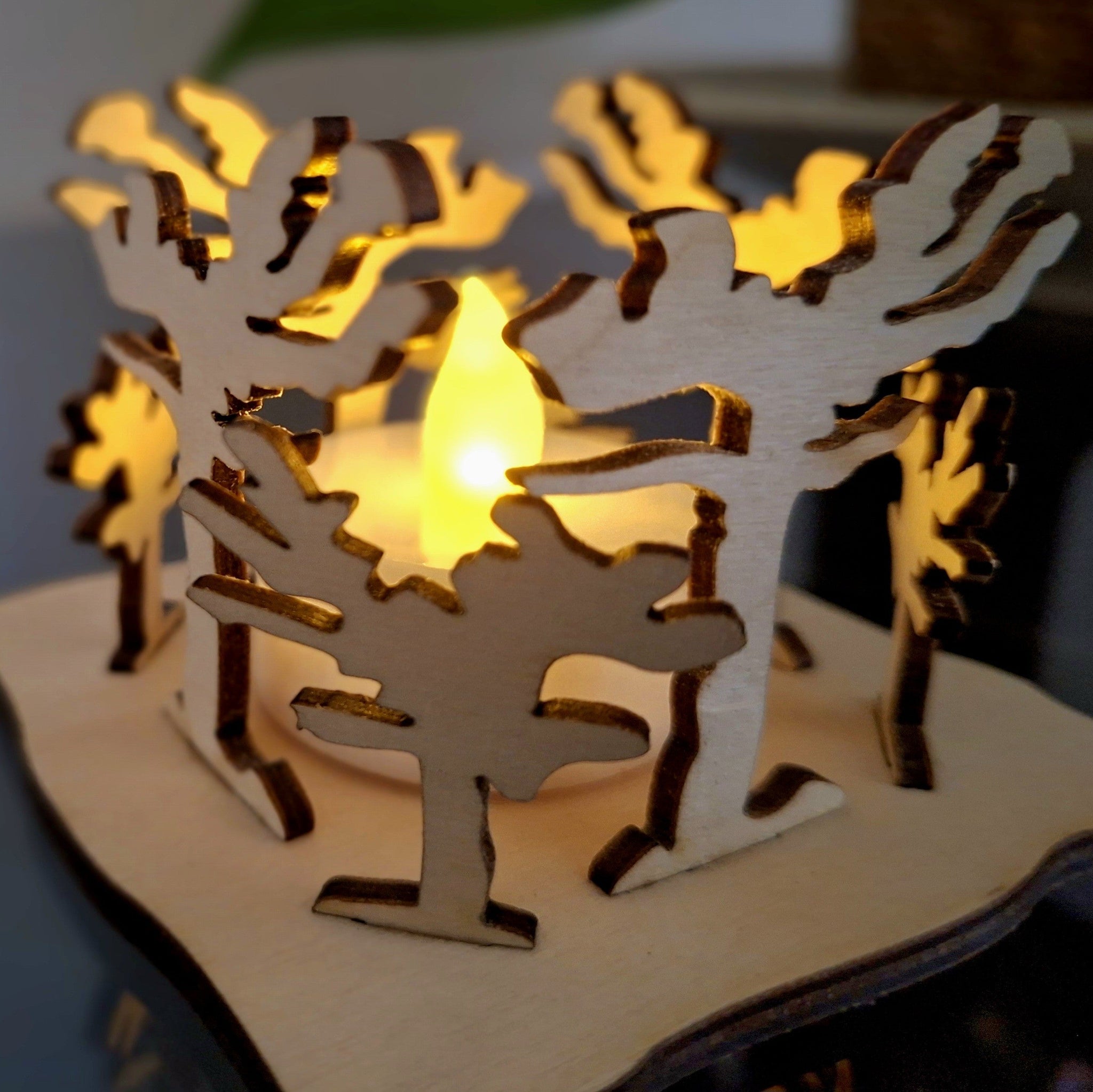 Kaunis, kelopuiden reunustama tuikkualusta. Yhdelle tai kolmelle ledtuikulle.