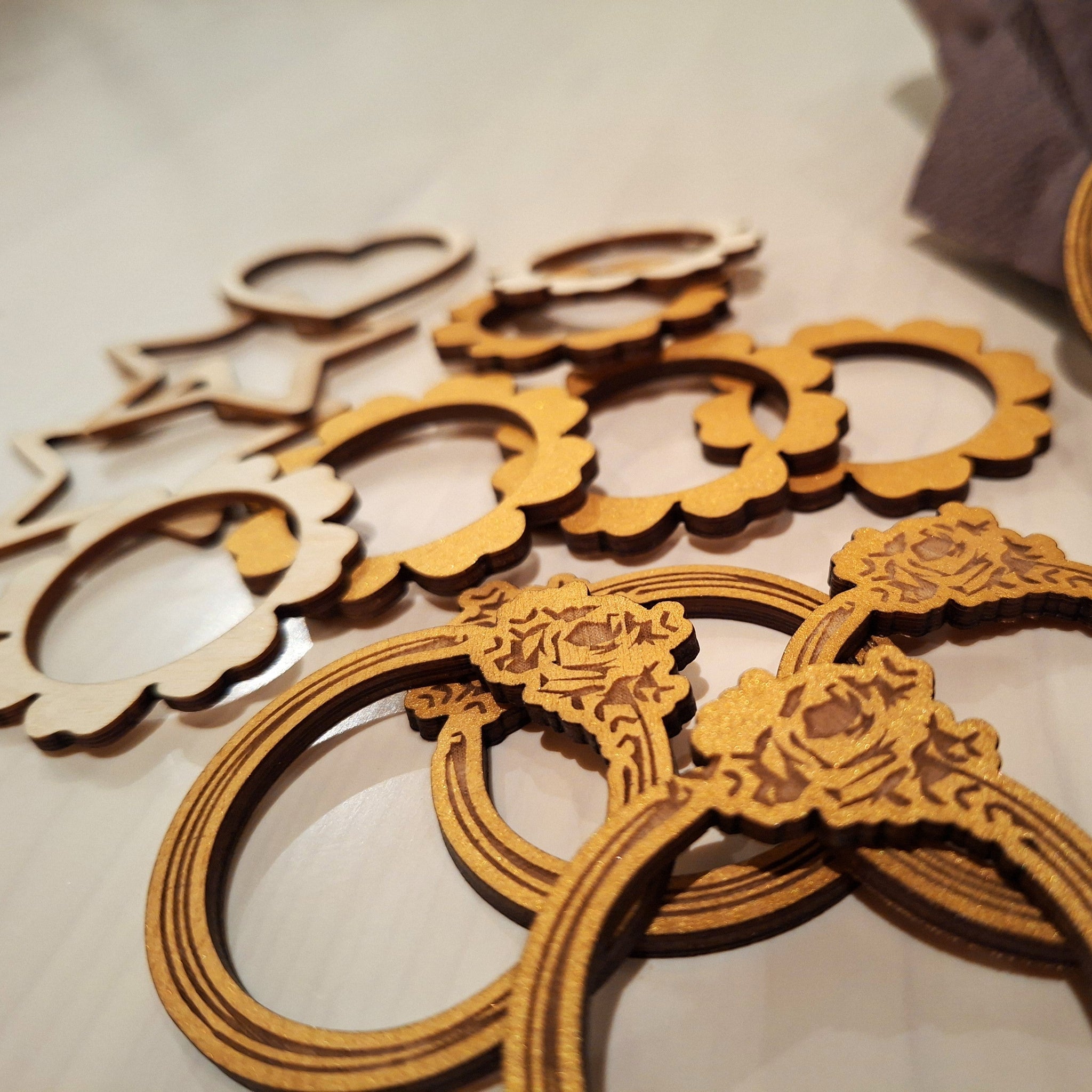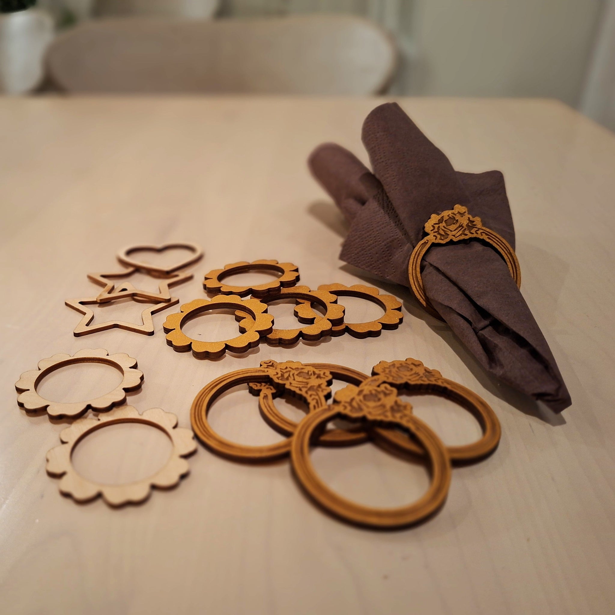 Kauniit lautasliinarenkaat koivuvanerista. Valittavissasi on useita kuvioita: tähden, sydämen, lehtikranssin tai kukan muotoinen servietinpidike.