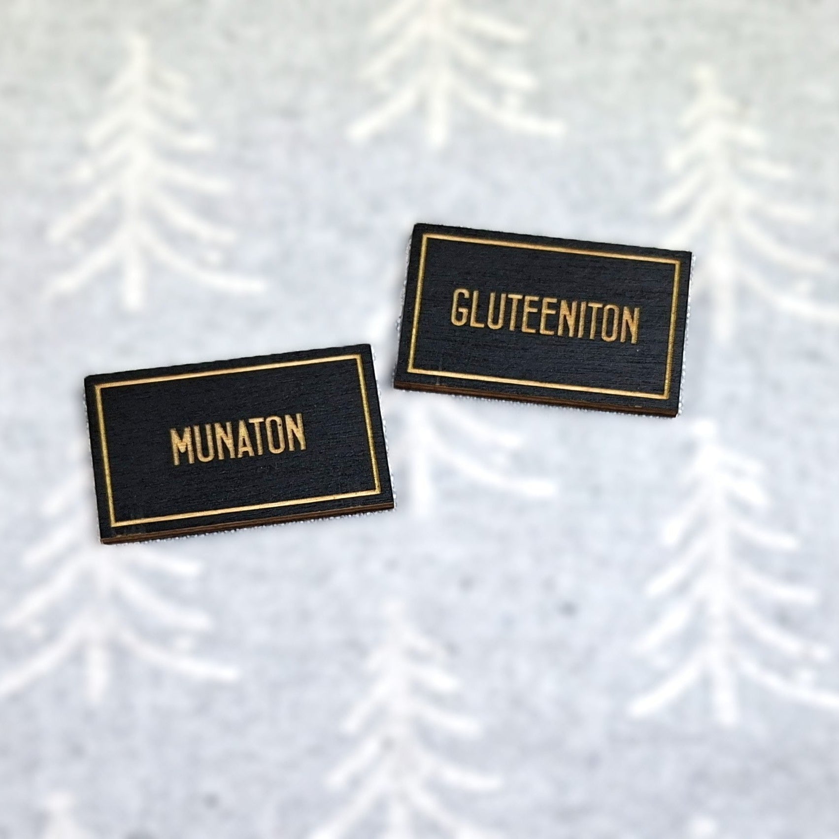 Nämä kauniit kyltit juhlapöytään viimeistelevät kattauksesi. Laktoositon, gluteeniton, maidoton, munaton, vegaaninen, kasvis ym. kylttejä on saatavilla sekä puunvärisenä että mustana. Voit myös kirjoittaa kommenttikenttään, jos haluat jonkun muun tekstin kylttiisi. Kyltin koko on noin 3 x 5 cm.
