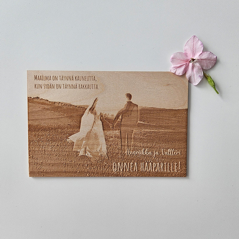 Hieno kotimaisesta koivuvanerista valmistettu kortti hääparille erottuu varmasti muiden korttien joukosta!